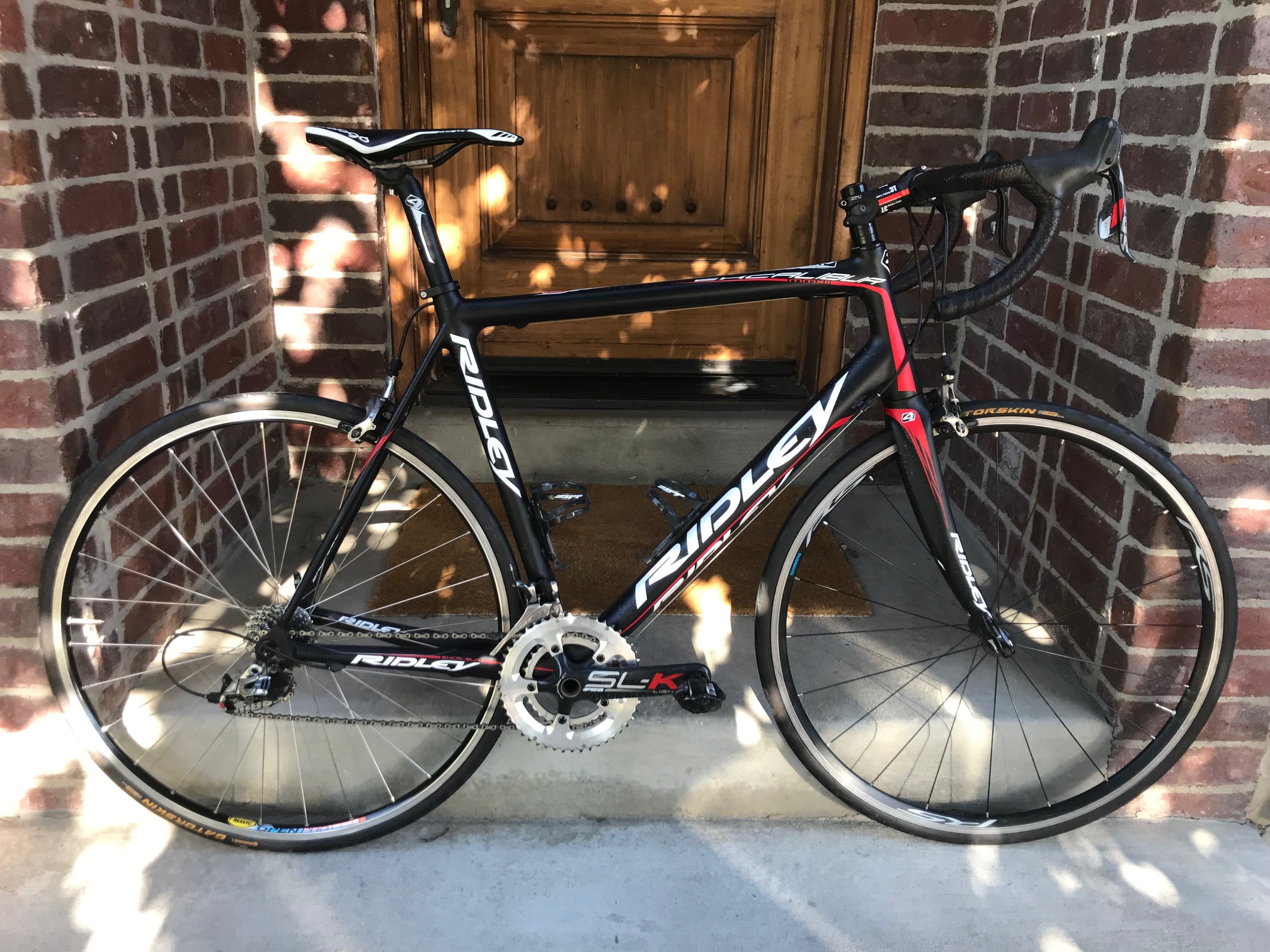 This is a 58cm (Large) 2013 Ridley Excalibur in excellent shape; it's Sram Red throughout (10-speed). The stock Fulcrum wheels were replaced with a Shimano RS up front and Mavic Open Pro in the rear.